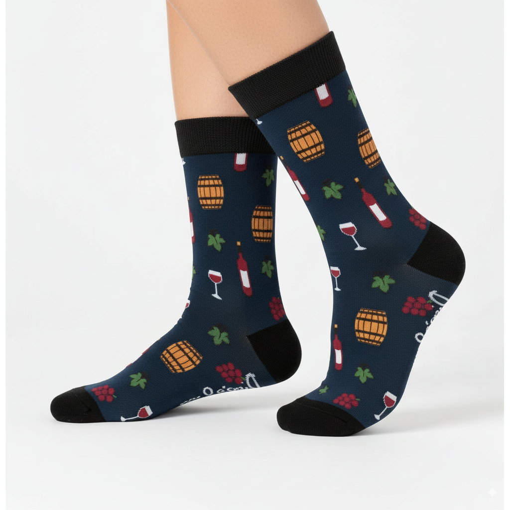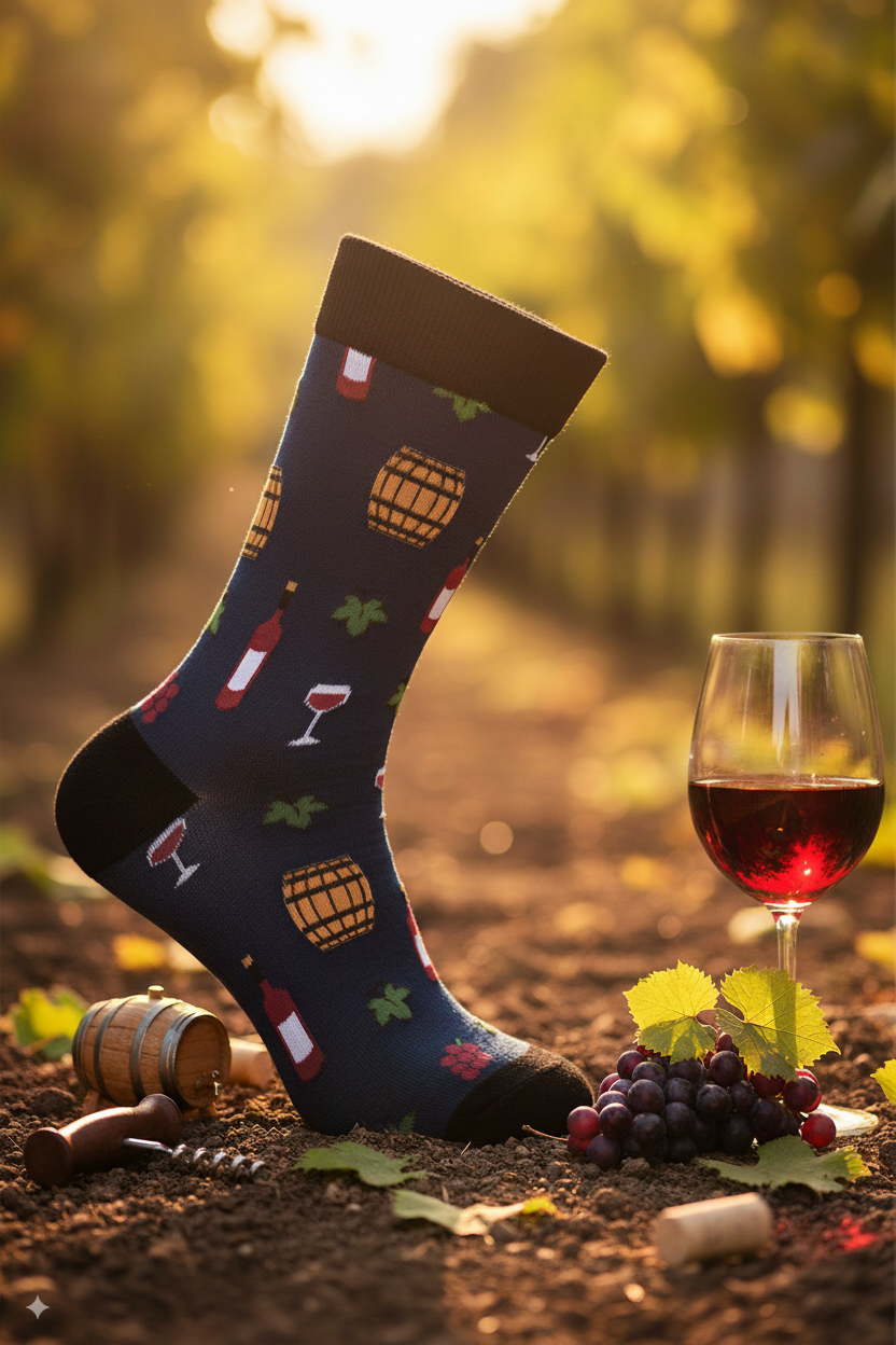 ¡Un brindis en cada pisada. Nuestro calcetín es para esos amantes del buen vino que saben disfrutar cada copa… y cada paso. Con un diseño inspirado en viñedos, barricas y copas rebosantes, es el accesorio perfecto para quienes llevan el placer del vino en el corazón!.